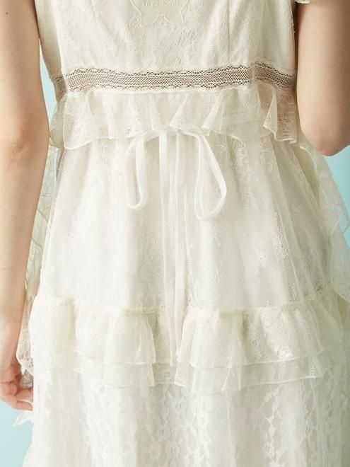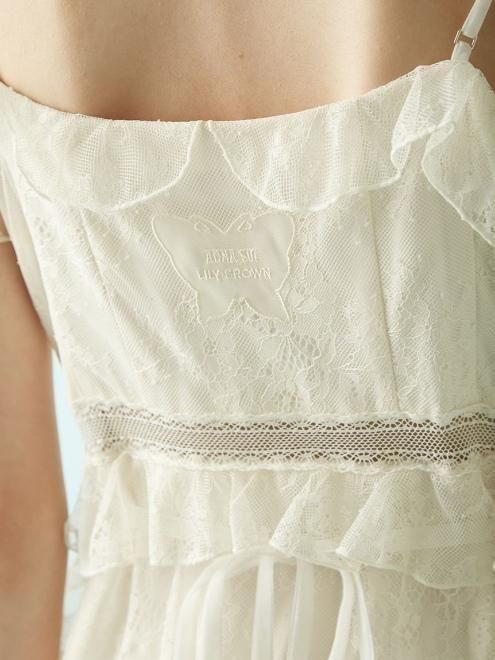 ANNA SUIとのコラボレーション繊細な2種類のレースを贅沢にあしらったスペシャルドレス。背面には蝶と2ブランドのロゴ刺繍を施し、バックスタイルにもこだわりを。肩とウエストにあしらったベルベットテープが、レースとの素材コントラストを際立たせ、上品なアクセントに。