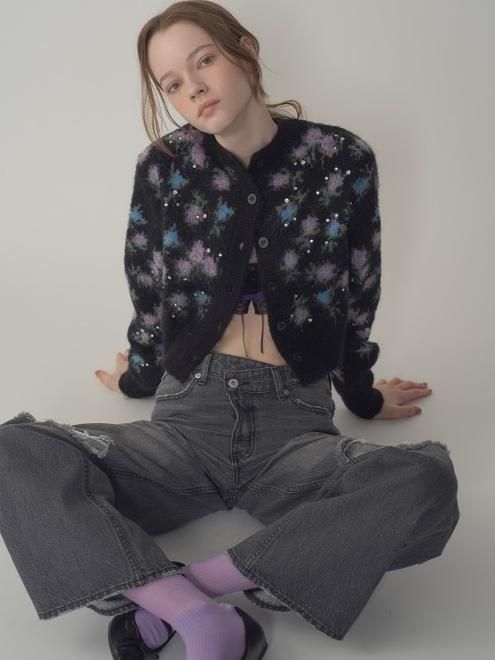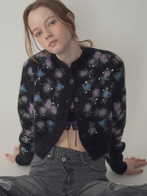 ANNA SUIのアーカイブ柄を使用した、特別感あふれるジャガードニットカーディガン。クラシカルな柄にビジューをあしらい、華やかさと奥行きをプラス。