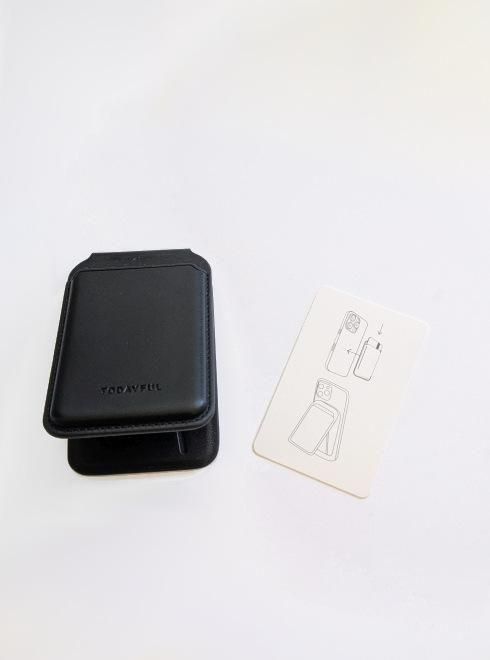 ミニマルなデザインが魅力のマグネットスタンド。背面にクレジットカード・ICカードが収納できるスリムなポケット付き。これひとつで身軽に外出できる便利なアイテム。
