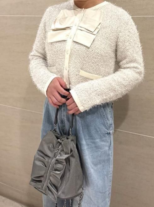 正面のリボンのようなギャザーフリルが目を惹くサックバッグ。