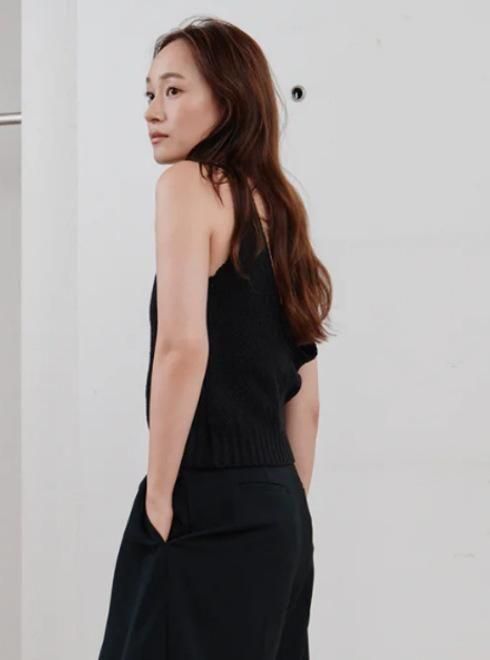 鎖骨がきれいに見えるラウンドネックと、華奢な肩まわりのラインが上品な印象を与えます。