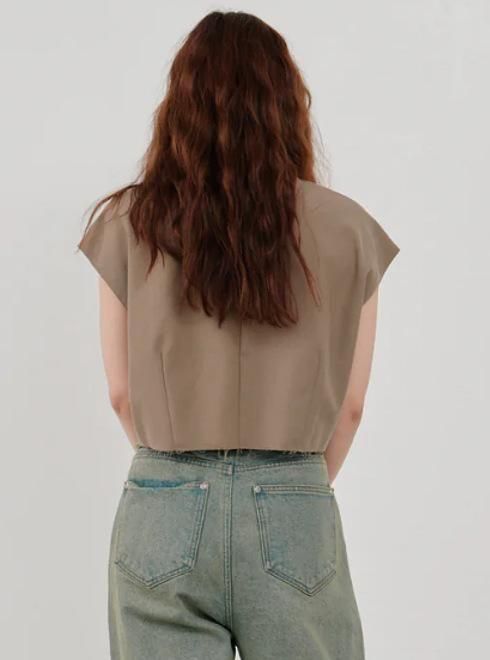 シャープな襟元と切りっぱなしの裾が、抜け感のある表情を演出します。