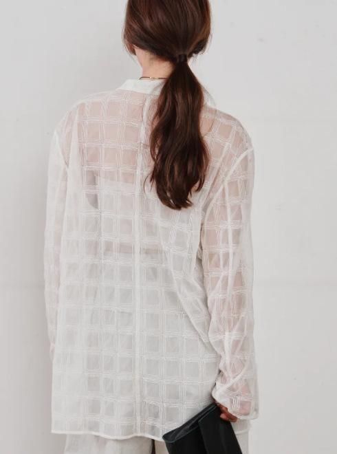 オリジナルチェックのインド刺繍が印象的な、シアー素材のレイヤードシャツ。
