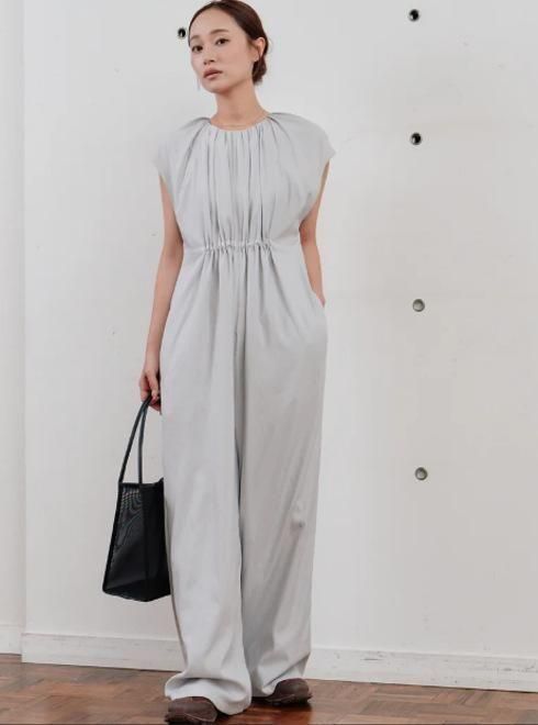 ギャザーの表情が際立つ、ノースリーブのジャンプスーツ。