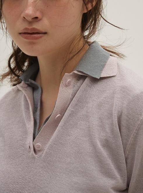 異なる糸を使用したレイヤードデザインがポイントのポロニット。配色がさりげないアクセントとなり、透け感のある編み地が軽やかさをプラス。
