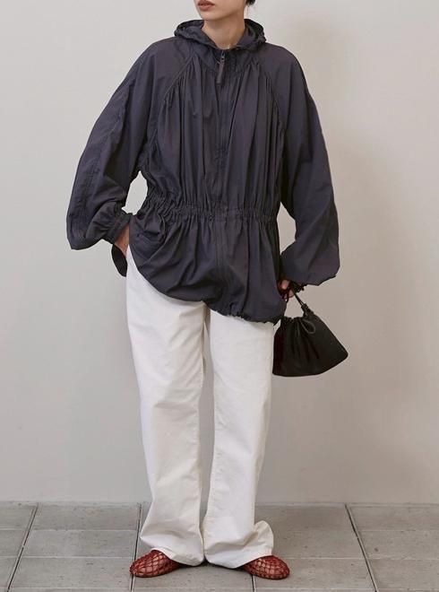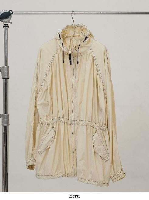 軽く滑らかなナイロン素材を使用したブルゾン。前後に贅沢なギャザーを施し、立体感と奥行きを演出。カジュアルなデザインながら、タック入りのボトムスやスカートとも好相性で、スタイリングに程よい抜け感をプラスしてくれる一枚。