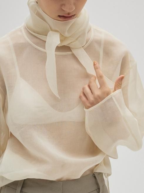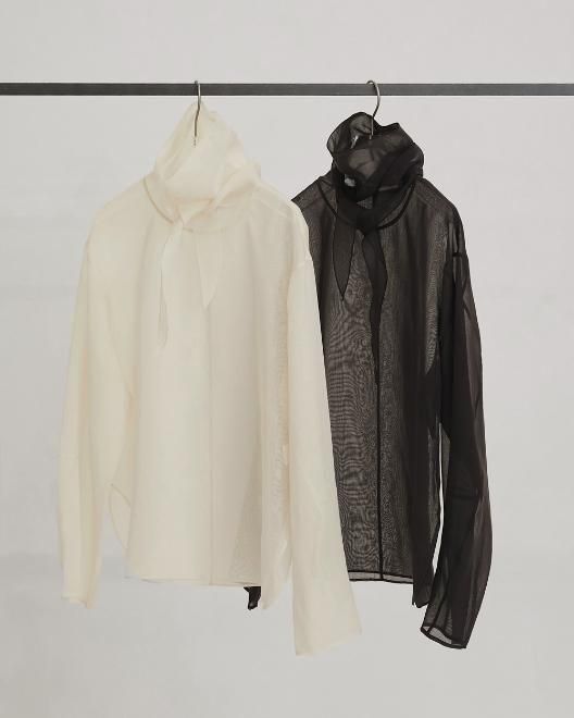 シワになりづらく、上品な透け感のあるオーガンジー素材を使用したブラウス。タイネックデザインはスタイリングにさりげないアクセントを加え、ボトムスのシルエットを選ばず様々な着こなしに馴染む一枚です。