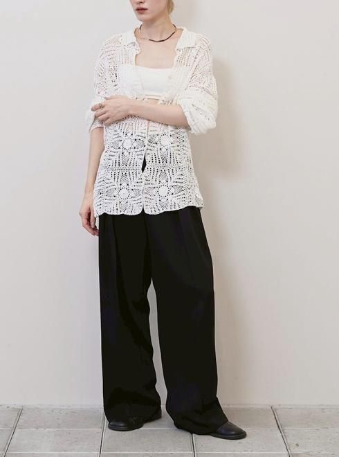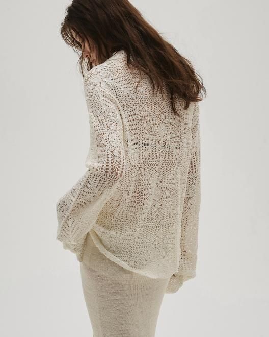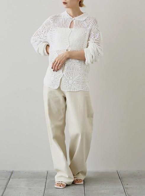 華奢なコットン糸を使用して、南インドで一つ一つ丁寧に手編みで編まれたかぎ針のニットシャツ。繊細な編み柄とシーズンムードたっぷりな素材感が魅力。透け感と体のラインに程良く馴染むシルエットが女性らしく、シンプルなボトムスに合わせるだけでこなれた印象に。