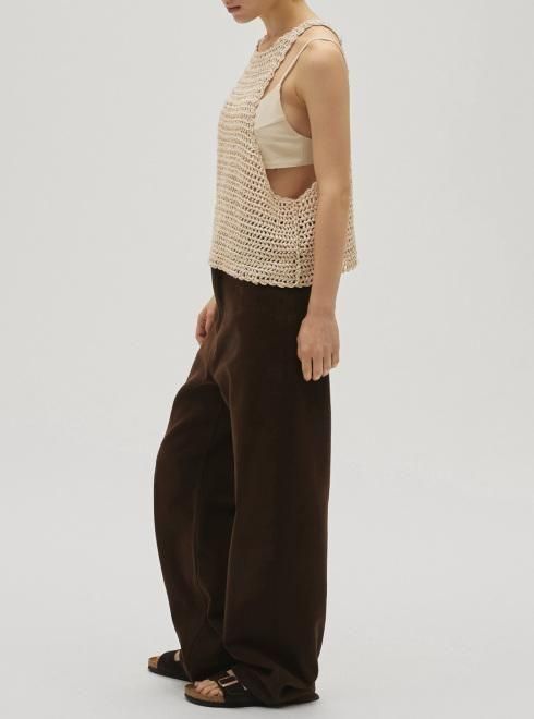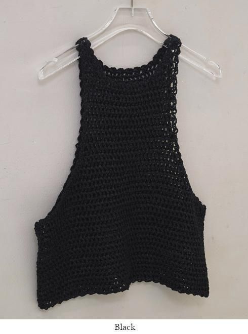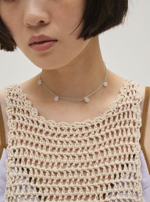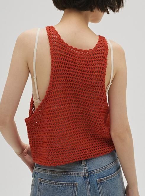 さらっとしたテープ状の糸で編み上げたニットタンクトップ。軽やかでドライな肌触りが心地よく、襟ぐりとアームホールに施したスカラップが、シンプルなデザインに女性らしいニュアンスをプラスします。