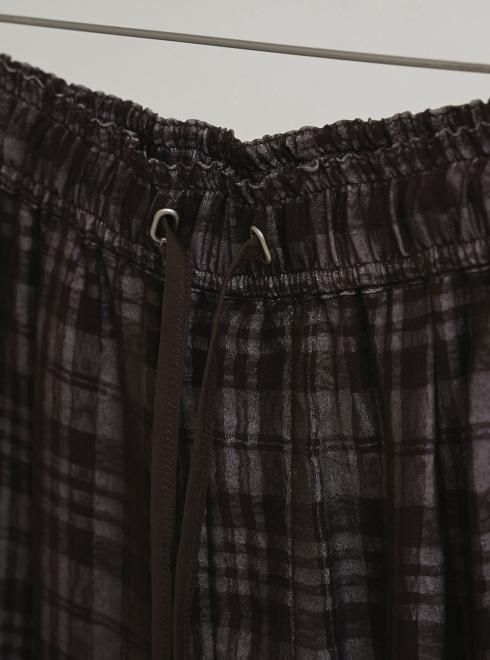 国内で織り上げたオリジナルのジャガード生地を使用したパンツ。チェック柄にチュールを重ねたような、奥行きのある表情が魅力。ウエストはゴム仕様でリラックスした履き心地。