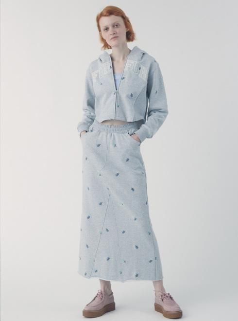 オリジナルのクロスステッチのバラ柄刺繍が施された程よい肉感の裏毛のロングスカート。デニムスカートのディテールを落とし込んだ切替えやリベットのデザインがアクセントになっています。