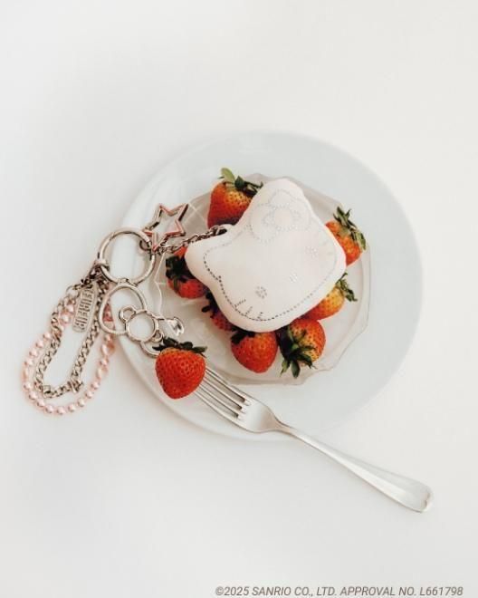ハローキティとのコラボレーション。トレンド感あふれるラインストーンで表現したクッションチャームが愛らしいアイテム。オリジナルで作成したFURFURの刻印入りチャームも特別感が◎。