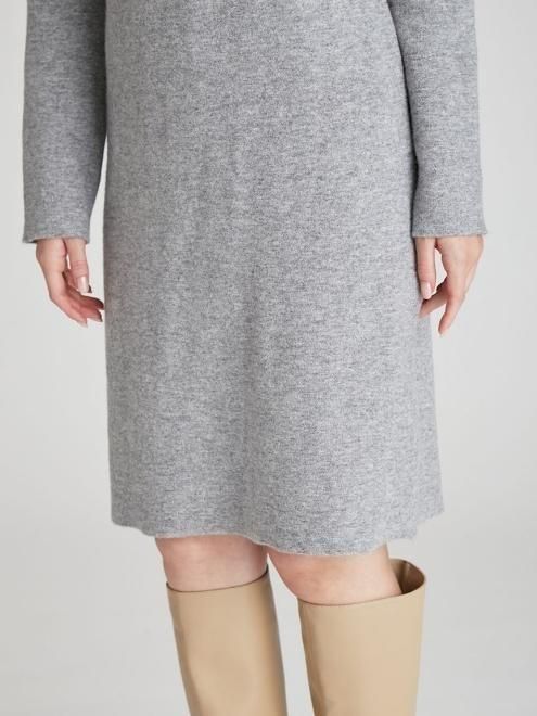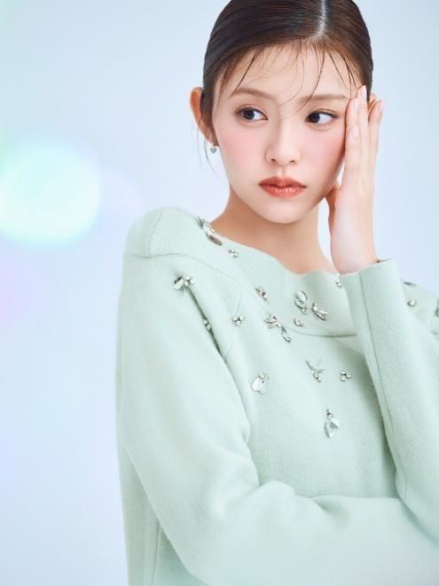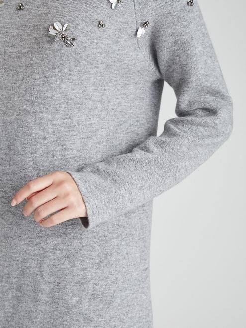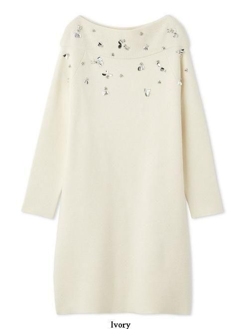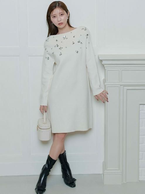 襟ぐりにCWND255074のカーディガンと同じモチーフの手付けビジューを施したミニ丈のニットワンピース。