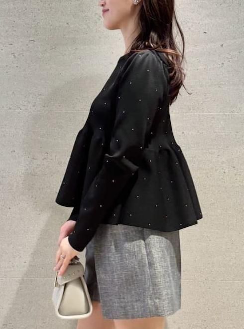 繊細なビジューがきらめくペプラムニットプルオーバー。ポリエステルのハリ感と弾力のある糸を使用した軽い着心地が特徴です。リブ編みで程よくフィットしつつ、切替下からはフレアに広がるペプラムシルエットで、女性らしいデザインに仕上げました。やや短めの丈感なので、どんなボトムスともバランス良く着ていただけます。