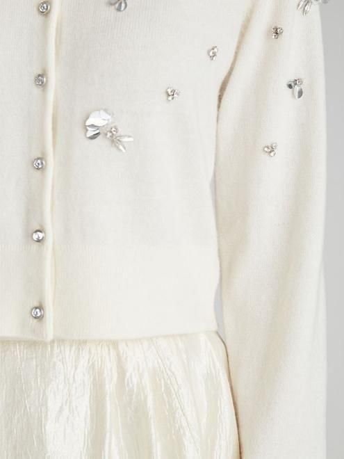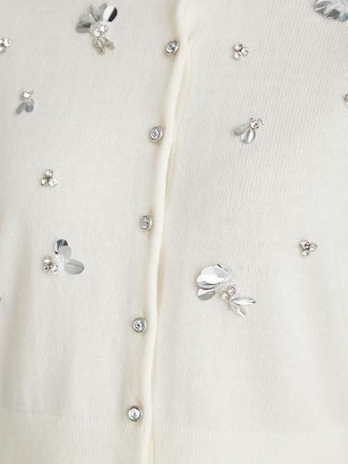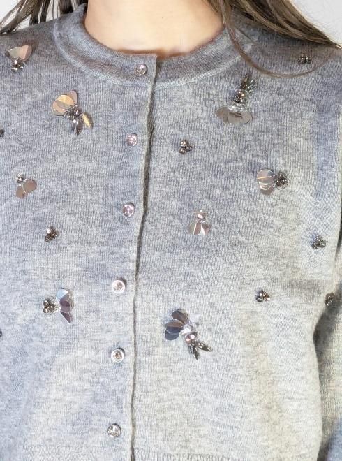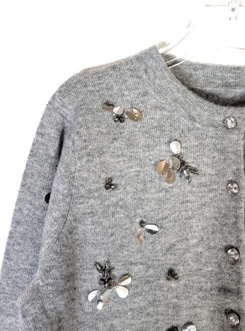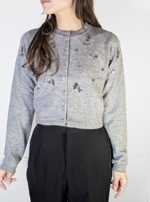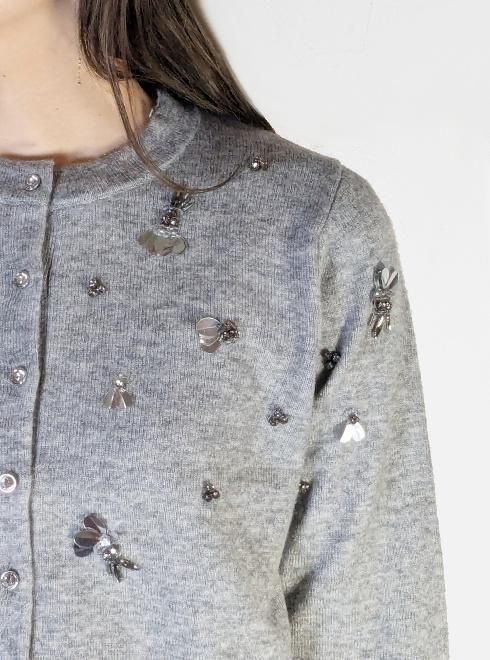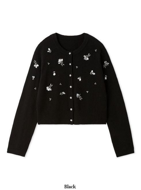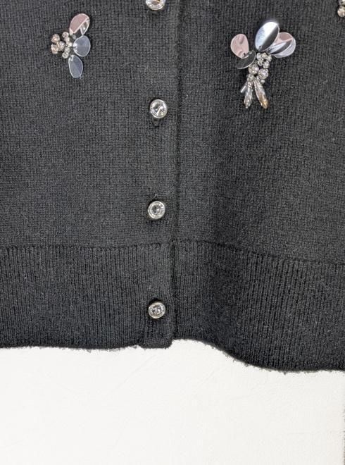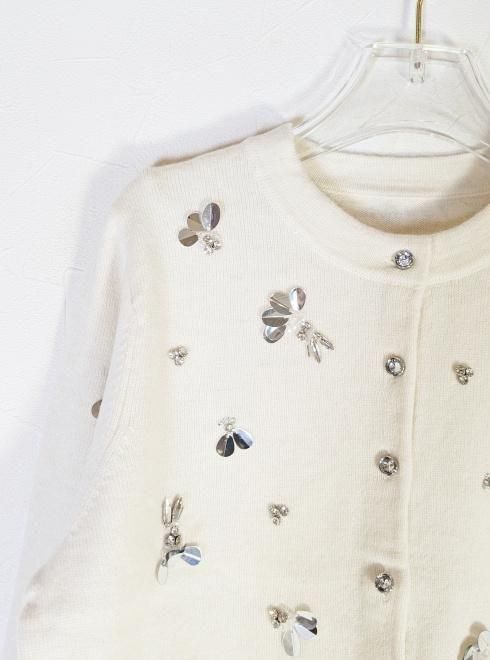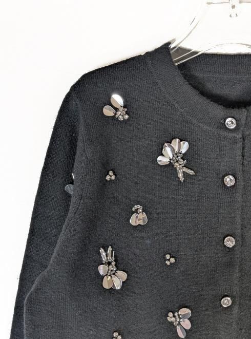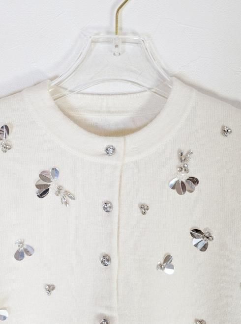 花びらのようなスパンコールとビジューを散りばめた、華やかで上品な印象のカーディガン。