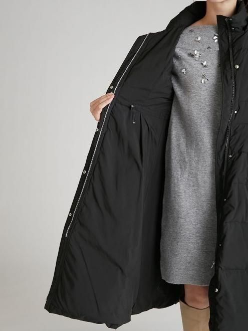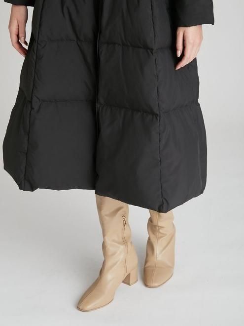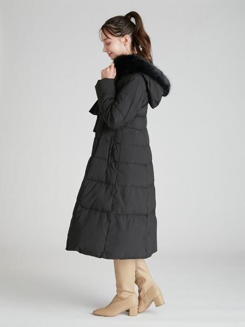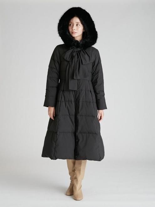ホワイトダック88%、フェザー12%を使用したフィット感のあるフレアシェイプのロングコート。