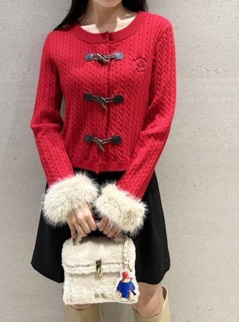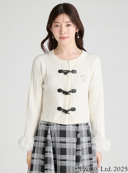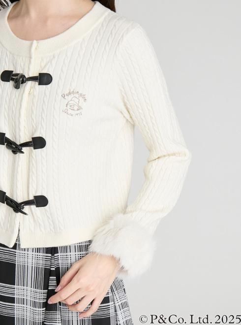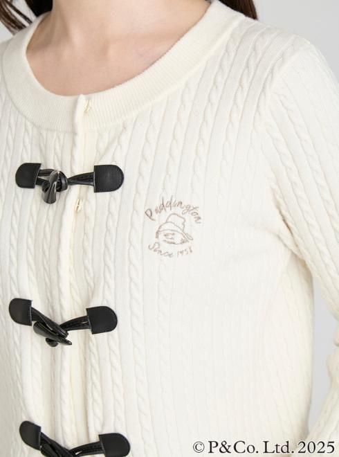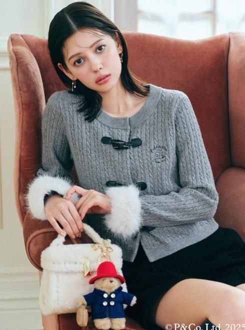 パディントンのダッフルコートを連想させるトグル釦がキャッチーなニットカーディガン。クラシカルなケーブル柄ニットの袖口にはボリュームのあるファーを施し、パディントンのふわふわの毛並みをイメージしました。胸元には微笑むような表情と、大きな帽子が愛くるしいパディントンの手描き風イラストと筆記体の文字を組み合わせ、エンブレム調に刺繍しました。世界中に愛されるパディントンの世界観とCELFORDのキャッチーな上品さをMIXしたコラボレーションアイテムです。