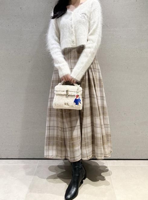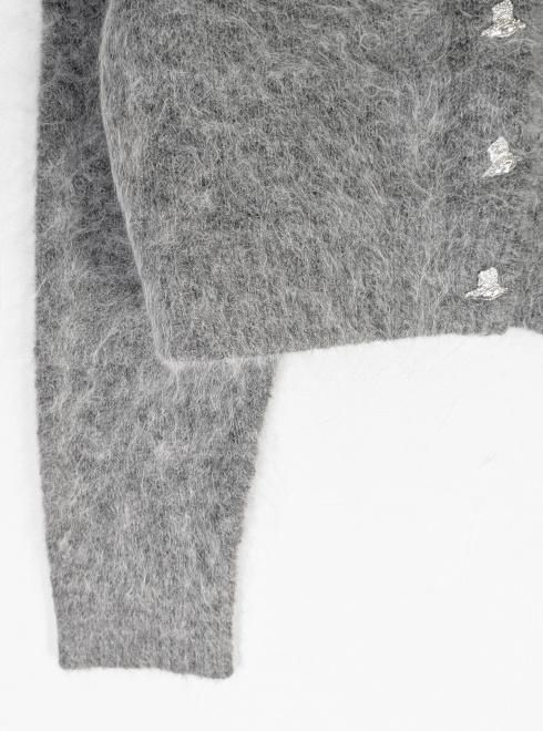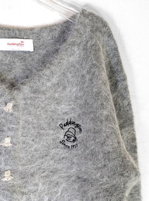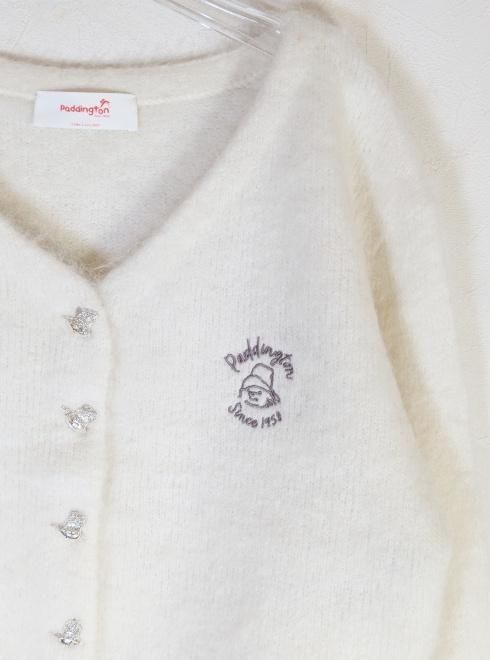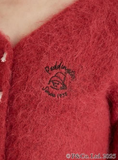 フロントに光るパディントンのボタンがポイントのふわふわカーディガン。ペルーの叔父さんからもらった大切な古いブッシュハットはキラキラビジューで敷き詰めました。ニットに使用した糸はアルパカ混の暖かく、軽い風合いでリュクスな印象の編み上がりに。サイズ感もインナーが見えず1枚で着映えする程よいサイジングにこだわりました。左胸にはにっこり笑ったパディントンを刺繍しています。