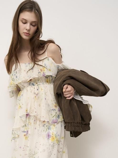 柔らかなシフォン生地にフリルを重ねて華やかに仕上げたドレッシーなオフショルロングフリルワンピースがお目見え。胸元やウエストまわり、袖口に波打つように仕立てた立体感のあるフリルデザインが動くとふわふわと揺れて、着こなしを印象的に魅せてくれます