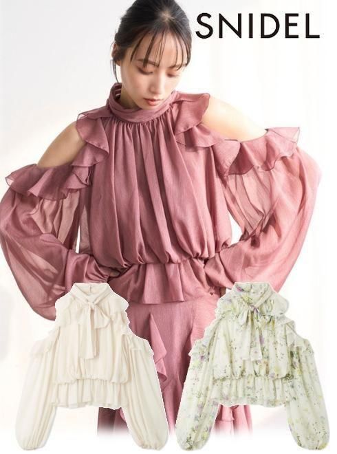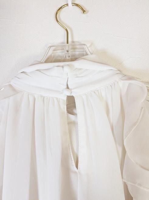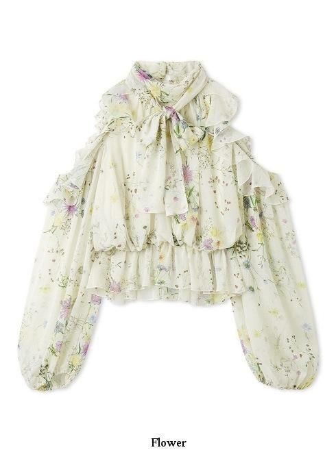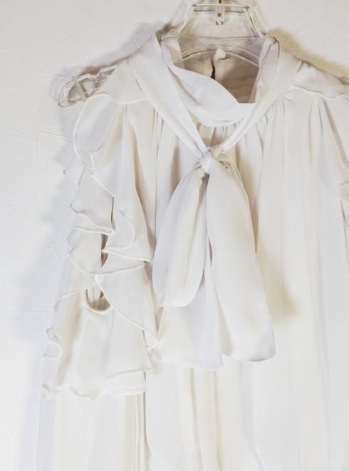 シアー感のある軽やかなシフォン生地や、キラキラと輝く楊柳生地をたっぷりと使用してお作りしたロマンティックなボリュームブラウスです。肩を大胆にカットし、肩から袖まで華やかなラッフルフリルを施して、抜け感を出しながらもエレガントに仕上げたデザインが目を惹きます。