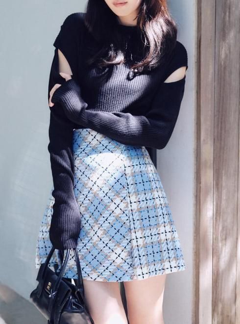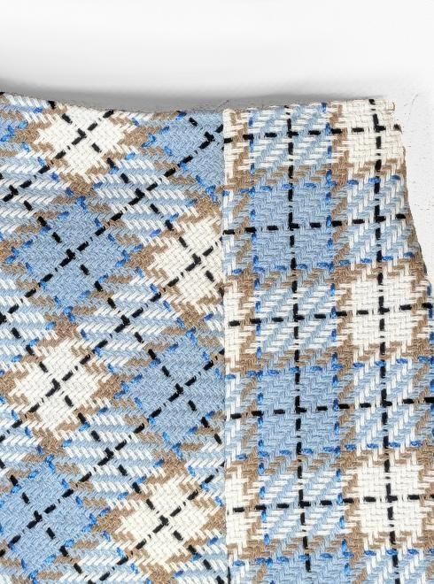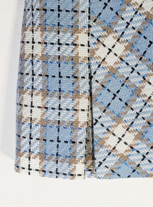 ブラックはモノトーンの千鳥柄調チェックで清楚に。サックスブルーは、淡いブルーを基調に、ベージュとホワイトを組み合わせた柔らかいトーンのフェミニンなチェック柄が魅力です。