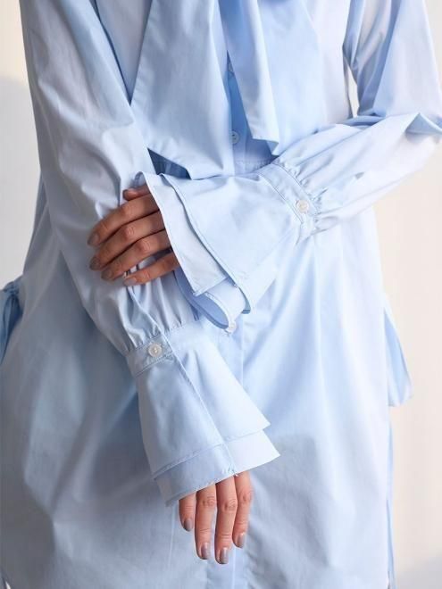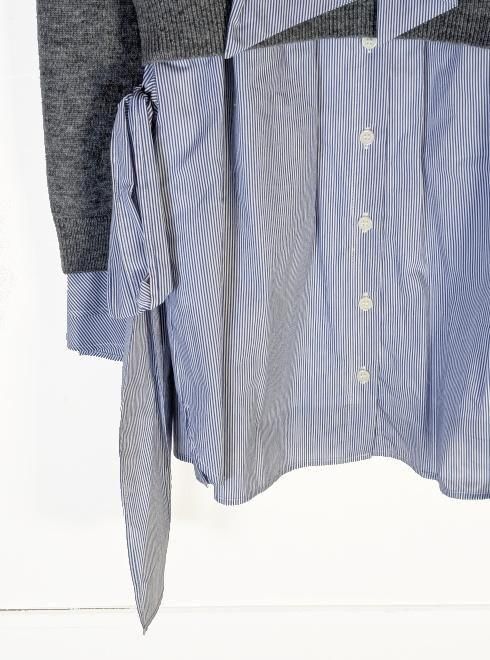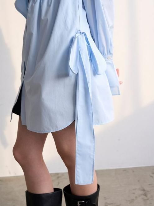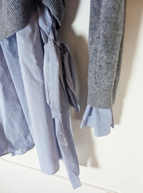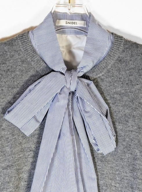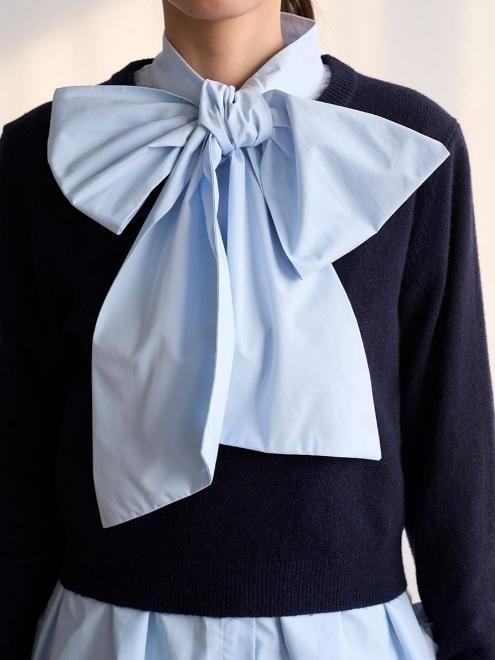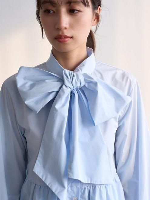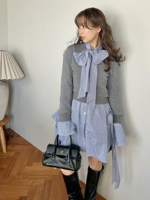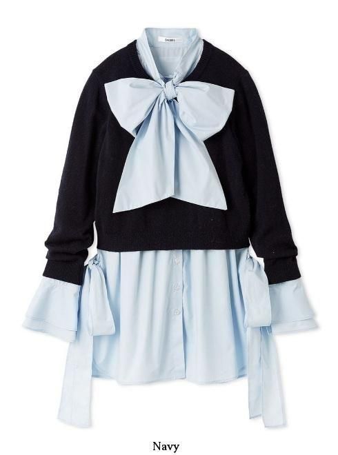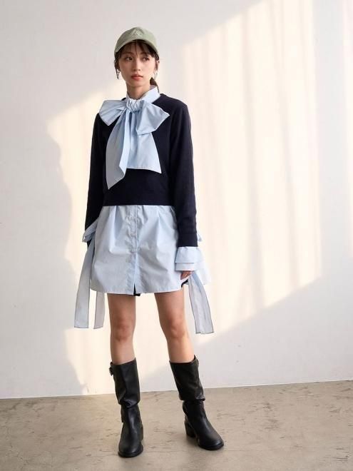 ボウタイシャツチュニックとシンプルなニットプルオーバーがセットになった着回し力抜群なアイテムです。シャツチュニックは綿混のきちんと感のあるシャツ生地を使用し、胸元のボリューミーなボウタイリボンが華やかな1枚に仕上げました。裏地を付け、細部までこだわったミニワンピとしても着映えるアイテムです。ニーハイブーツ合わせもおすすめ。