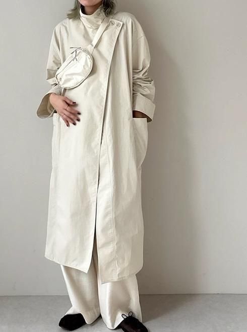 高めのスタンドカラーとトップのみにボタンをあしらったラフなデザインが特長的なロングコート。 ミニマルなフロントと大きめのサイドポケットがモードな中に程良くカジュアルさをプラスし、幅広いスタイリングに馴染む一着。長過ぎないロング丈が着回しやすく、抜け感あるオーバーなシルエットでこなれた印象に決まります。裏地のない軽やかな仕上げです。
