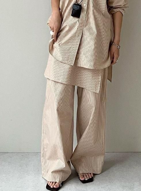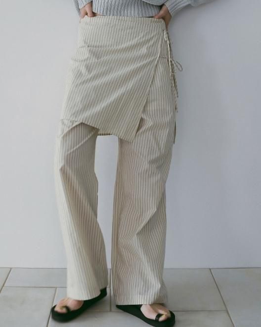 ストライプ柄のイージーパンツとラップスカートがセットになったレイヤードアイテム。パンツはタックが入ったストレートシルエットで後ろゴムで楽に履いていただけます。巻きスカートは、体に馴染むよう後ろにダーツを入れ、もたつかないように仕上げました。