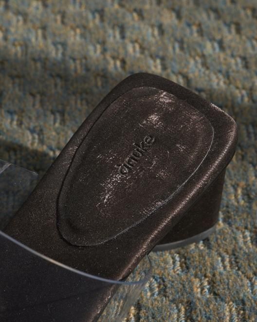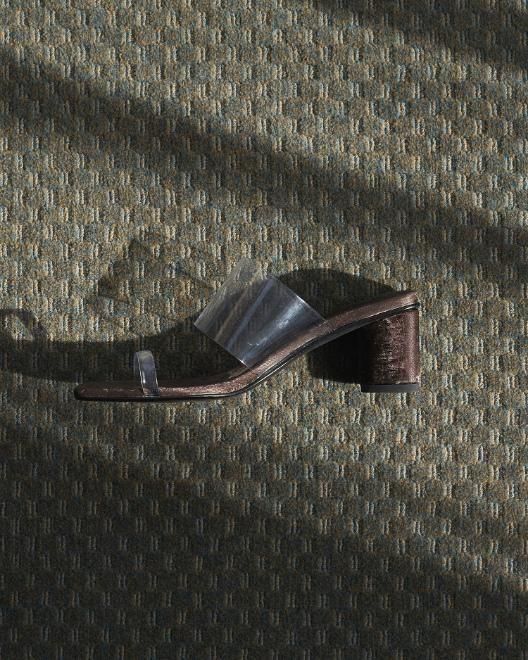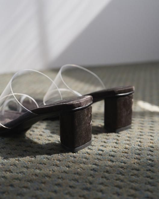 クリア素材とベロアのコンビが目を惹くヒールサンダル。太めのヒールと、しっかりと甲を覆ってくれる太めのアッパーに親指のホールデザインが、安定した履き心地に。ショートボトムやスカート合わせでしっかりとデザインを見せても、クリア使いが抜け感を添え、履くだけで足元を印象的に見せてくれます。