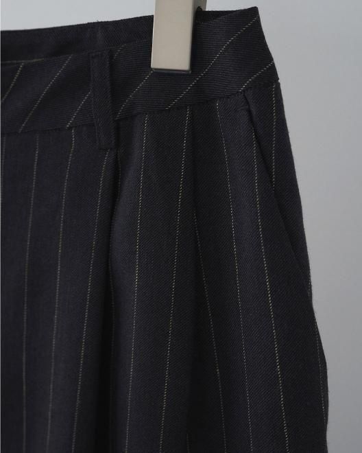 リネン素材を使用したワイドパンツ。オリジナルで織り上げた薄手の軽やかなリネン素材。タックを2本入れ、ルーズに仕上げたシルエットは、履くだけでこなれ感の出る1本。無地のブラウンと、ストライプ柄のネイビーの2色展開。