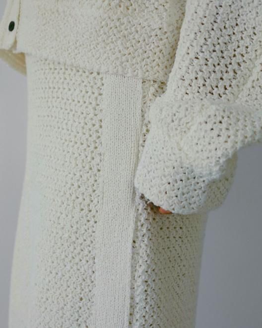 表情ある編み地が目を惹くクロシェニットスカート。壁糸と呼ばれる糸を使用し、立体的な編み地に仕上げています。編み地を変化させた、サイドのライン使いもポイント。コンパクトなTシャツやタンクトップなど、シンプルなトップスと合わせていただくだけでも、コーディネートが華やかになる一着。