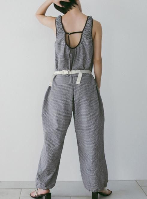 立体的なチェック柄のサッカー素材を使用したコンビネゾン。細かな柄感と落ち着いた色味の配色で、シックに着ていただけるチェック柄です。体のラインを拾わないラフなシルエットに、深めに開いた後ろのUネックデザインのバランスが、抜け感を演出。柄の配色に合わせたパイピングデザインや後ろのベルトデザインがポイント。
