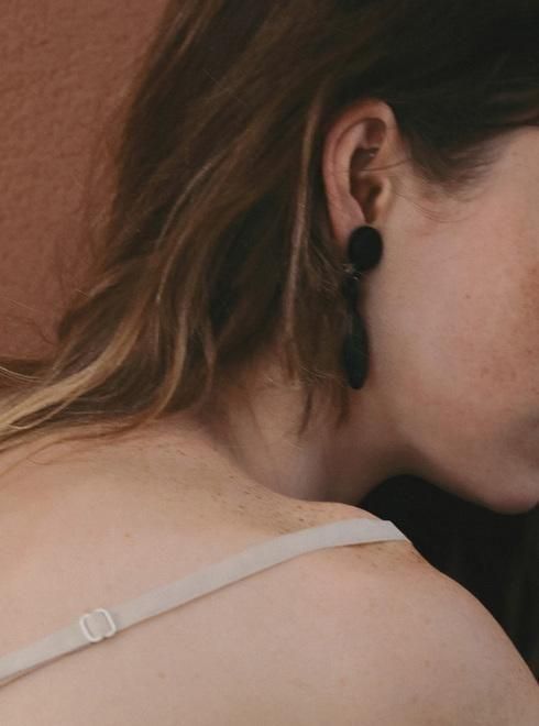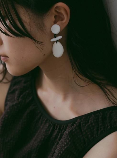 形の違う樹脂ストーンを細紐で連ねたイヤリング。ブラックはマットに仕上げ、紐も黒にしたワントーンに。ホワイトは艶ありでクリーンに仕上げ、黒紐を使った配色がアクセントに。スタイリングが軽やかになる春夏に、耳元で揺れるシックなモノクロカラーが、モードな印象を演出します。
