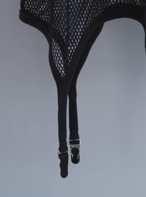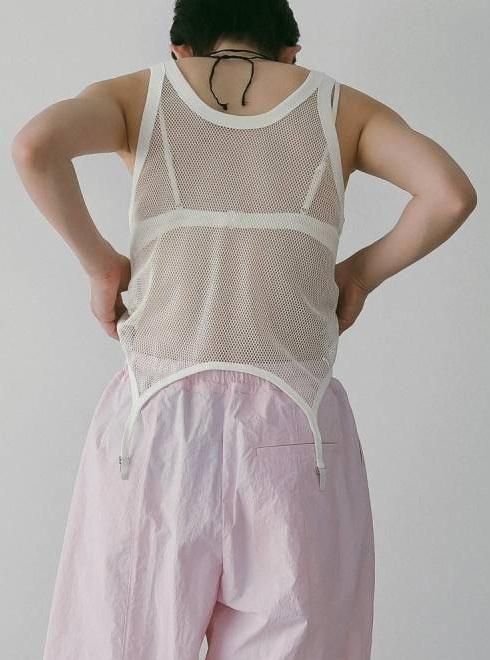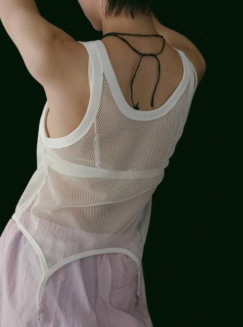 メッシュ素材を使用したデザインタンクトップ。コーディネートに一癖プラスしてくれるガーターデザインが、モードな印象の一枚。透け感のあるメッシュに、タンクやTシャツなどを重ねて、いろんなレイヤードスタイルをお楽しみください。春夏らしいカラーパレットで遊ぶのもおすすめです。