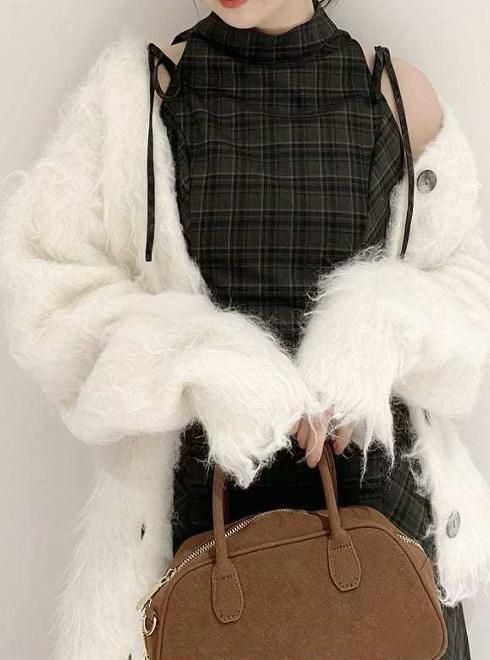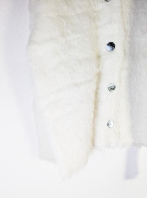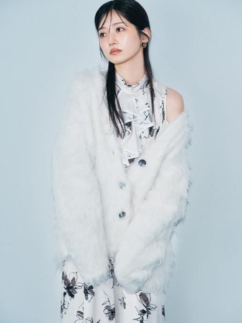 柔らかい毛足を掻いてふんわりと仕上げた、優しい表情のフェザーカーディガン。ボリューム感のあるシルエットながら、深めに開いたVネックがデコルテまわりをすっきりと見せてくれます。