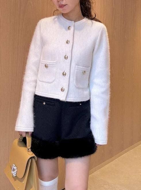 毎年人気のファー切り替えショートパンツが、クラシカルな金ボタンデザインでアップデート。毛足の長いファーで裾にボリュームを持たせつつ、脇上がりのライン設計が美脚見えを叶えます。