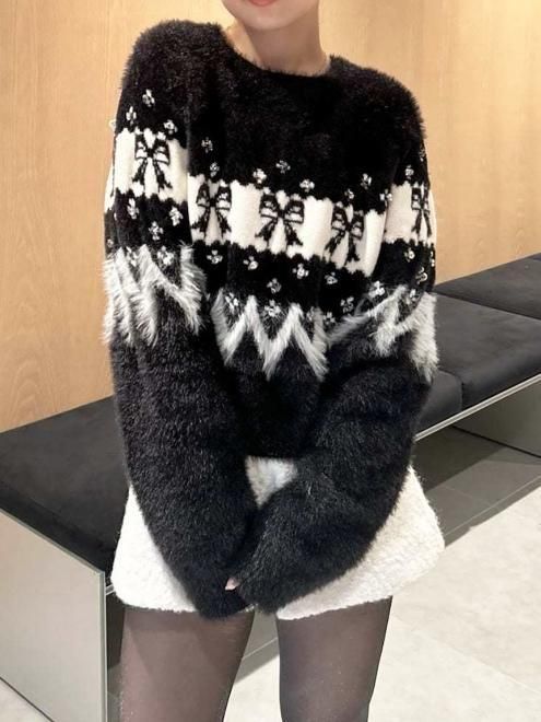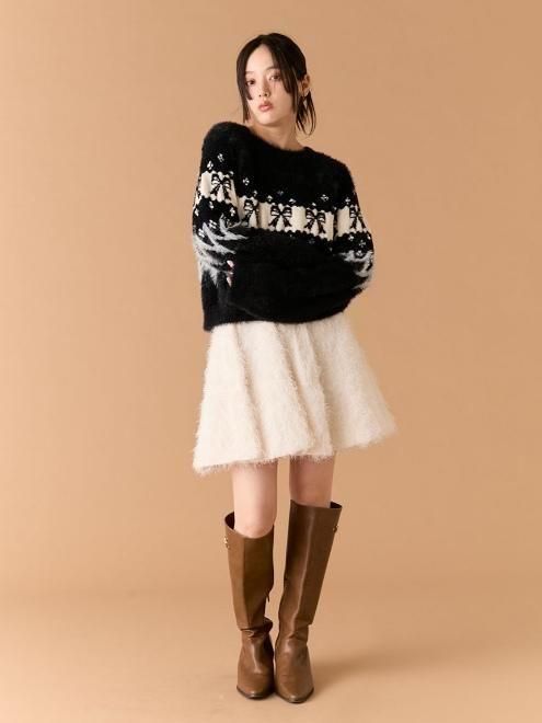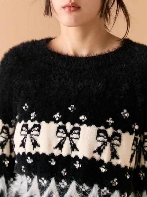 毛足の長いフェザーニットを3種類ミックスし、ふわふわの質感と立体感でリボン柄を表現した華やかなトップス。異なる2種類のビジューを贅沢にあしらい、存在感のある1枚に仕上げました。ジャスト丈なのでパンツにもスカートにも合わせやすく、コーディネートの主役になるアイテムです。