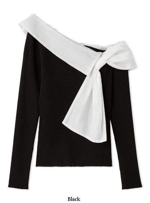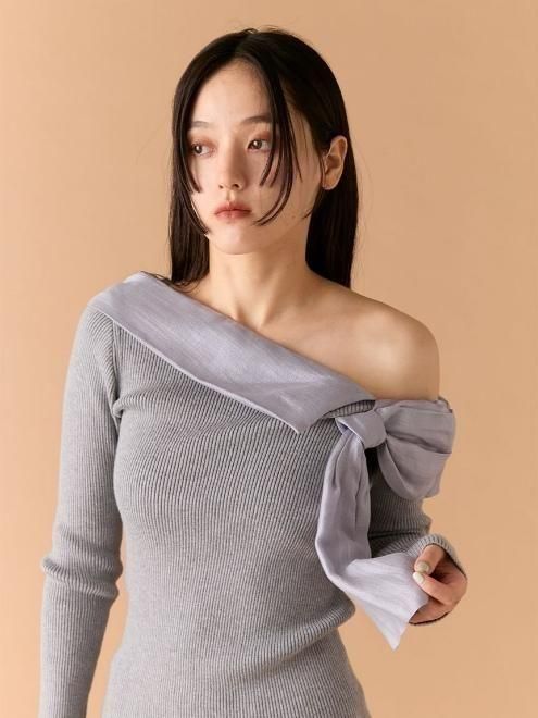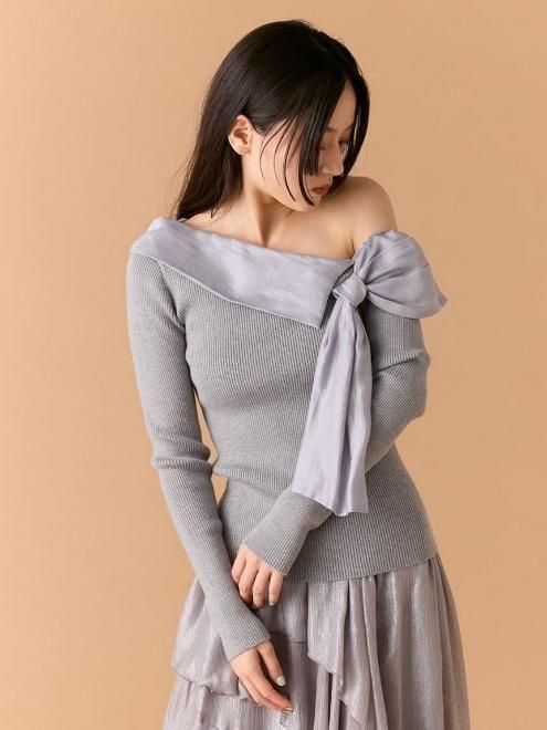 すっきりと開いたデコルテラインにリボンディテールを重ねた、エレガントな肌見せが叶うニットトップス。身体を包み込むように立体的にドッキングされたリボンは、どの角度から見ても美しく映えるデザイン。華やかさと上品さを兼ね備え、1枚で主役になるアイテムです。