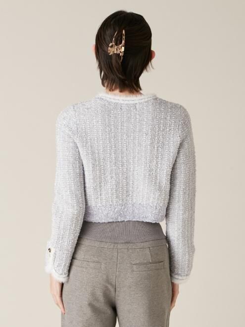 数種類の糸を編み込み、奥行きのある表情に仕上げたツイードニットジャケット。前立てと袖口にはフェザーヤーンをあしらい、華やかでフェミニンなアクセントをプラスしました。