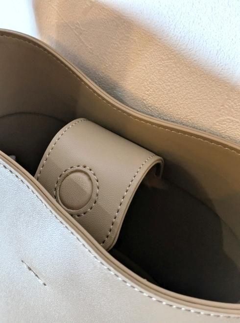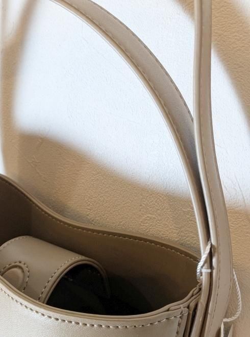 ショルダーストラップ付きで、肩掛けやクロスボディなどスタイルに合わせた持ち方が可能。開口部が広く、中身の出し入れもスムーズです。