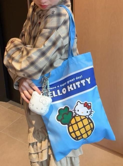 ハローキティとのコラボレーション。トマト缶とパイナップル缶のデザインが大胆にプリントされたトートバッグ。