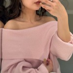 ドライタッチな質感とスクエア型の編み目、太めの襟リブでゆったりとしたシルエット等、