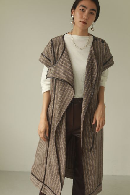 起毛がかったストライプ生地に、エコレザーのパイピングがアクセント。