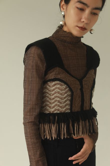 様々な編み地を組み合わせた、立体感のある表情が魅力のニットビスチェ。