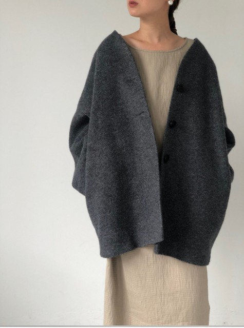 まるみをおびたコクーンシルエットで、おしりが隠れる丈感。