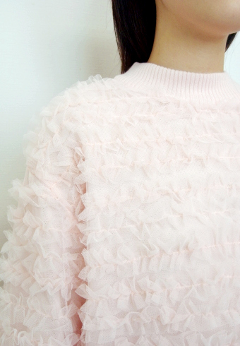 ギャザーを寄せたチュールのフリルがキュートなハイネックプルオーバー。