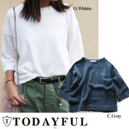 襟ぐり、袖口、裾周りをカットオフにしたトップスは、ドロップショルダーにデザインし、身幅もゆったりめのシルエットになります。