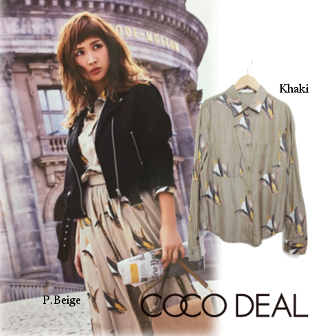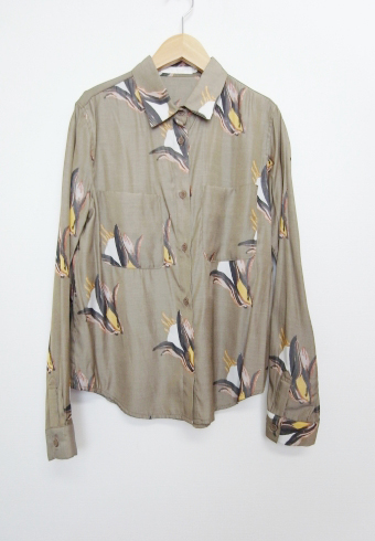 モチーフフラワーをツヤ感あるサテン地にのせたレトロモダンなシャツブラウス。