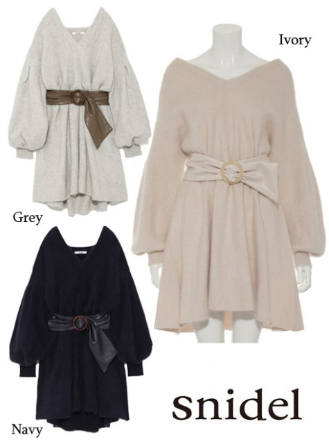 snidel(スナイデル)’ベルティッドファーライクニットワンピース’ 17,280円 アイボリー&グレー(※入荷時期:9月下旬~11月上旬)、ネイビー(※入荷時期:9月末~11月上旬)