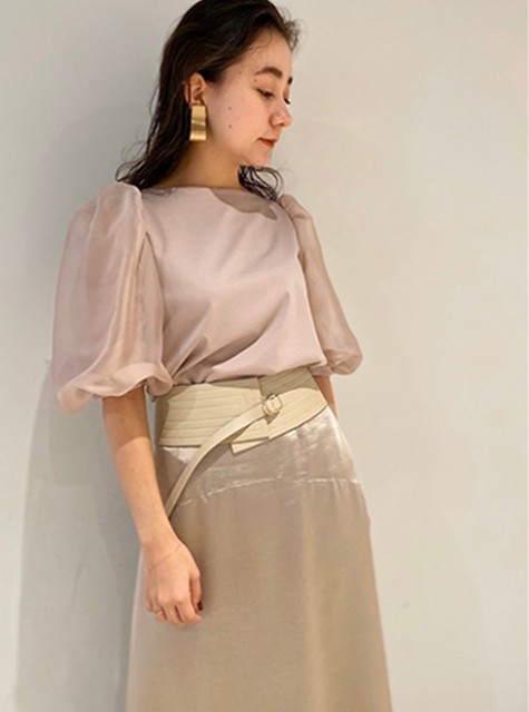 上品な光沢感の透けにくいカットソーとチュールのコントラストで上品に♪